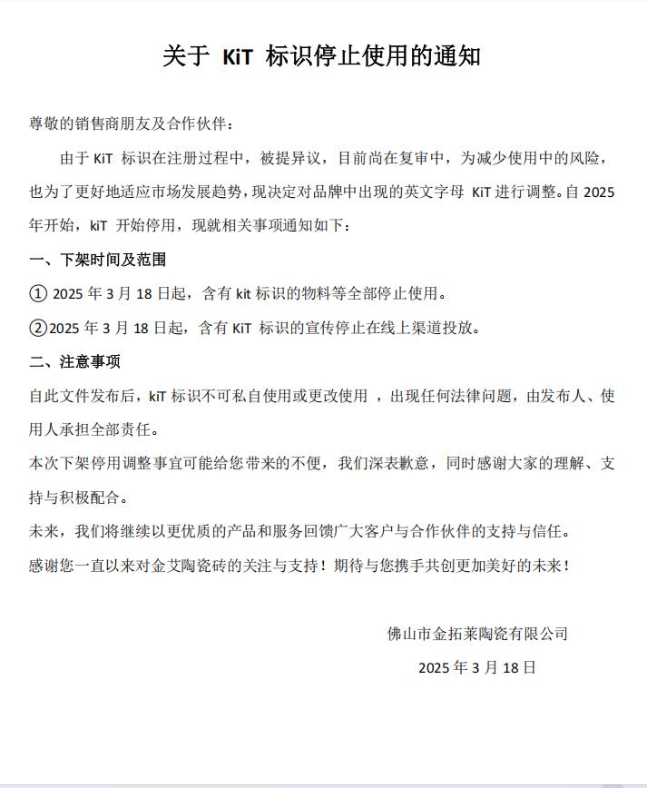關(guān)于KIT標識停止使用的通知——關(guān)于KIT標識停止使用的通知